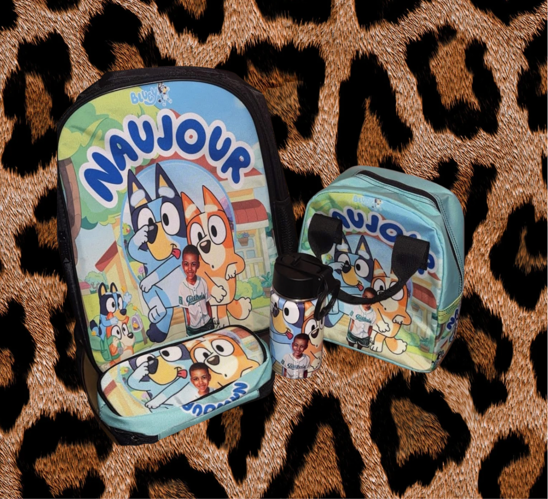 This custom bundle comes with a matching backpack, lunch bag, pencil case & water bottle—personalized with your child’s name, photo, or favorite character! Please note: each bundle is made with love and can take up to 3 weeks to complete.